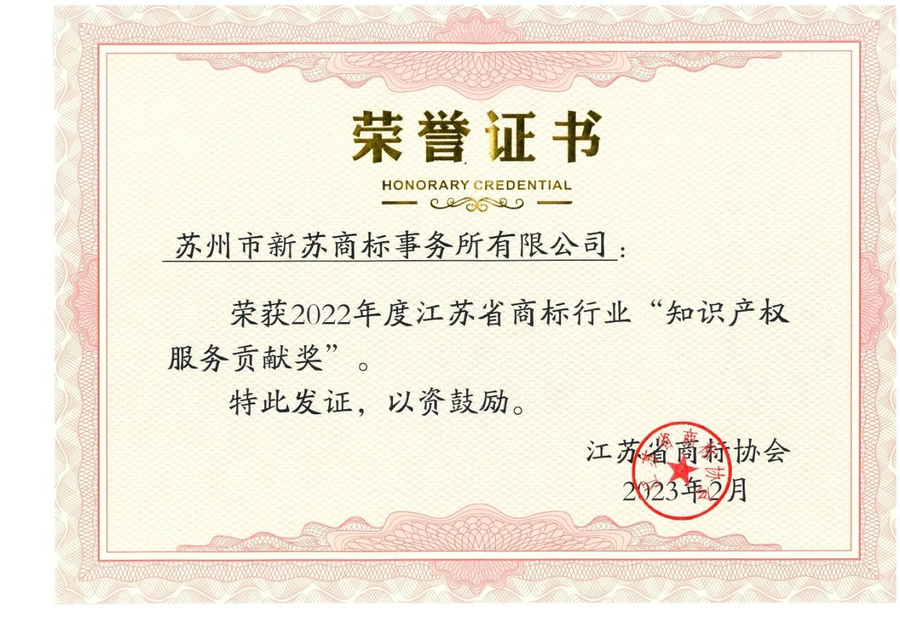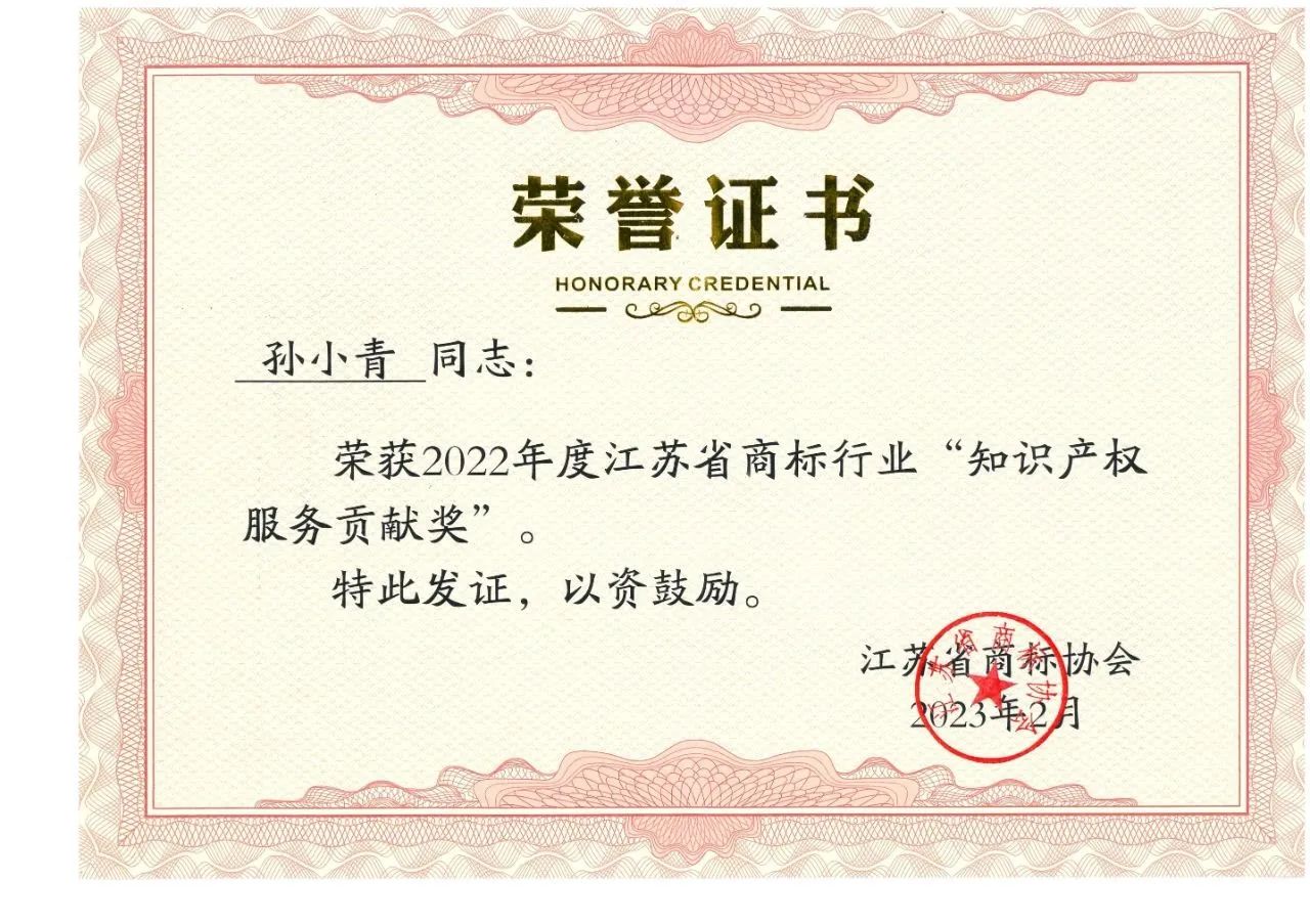 近日,江蘇省商標協(xié)會為江蘇省內(nèi)代理機構(gòu)及優(yōu)異個人頒發(fā)了“知識產(chǎn)權(quán)服務(wù)貢獻獎”,我所及我所孫小青副所長均受此殊榮!